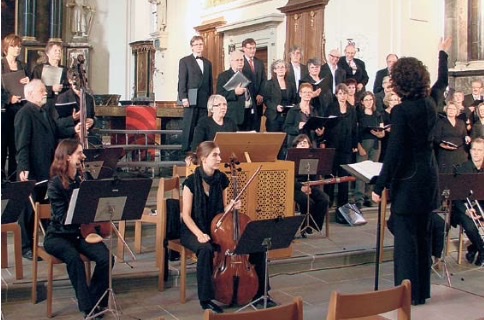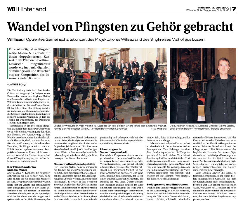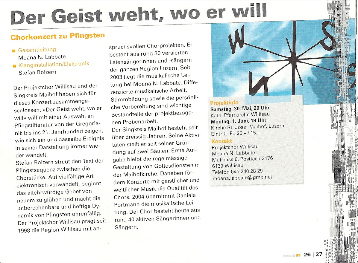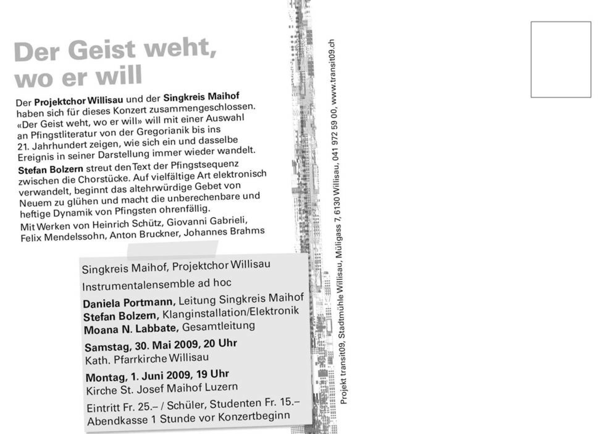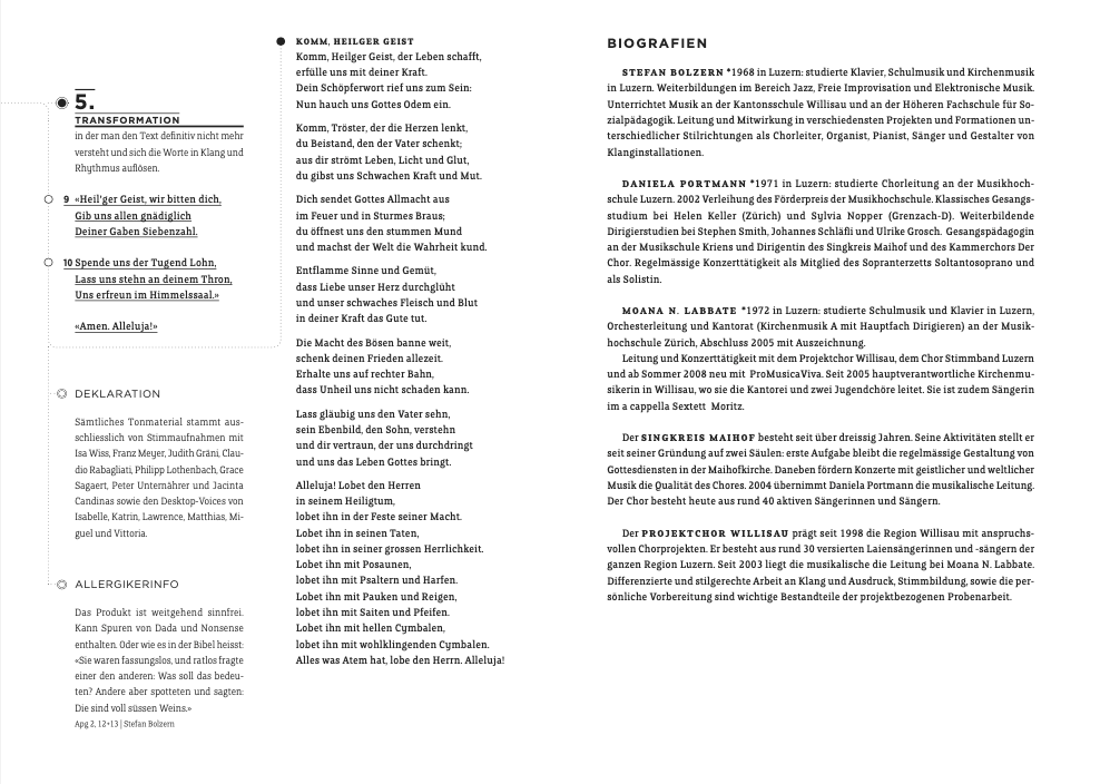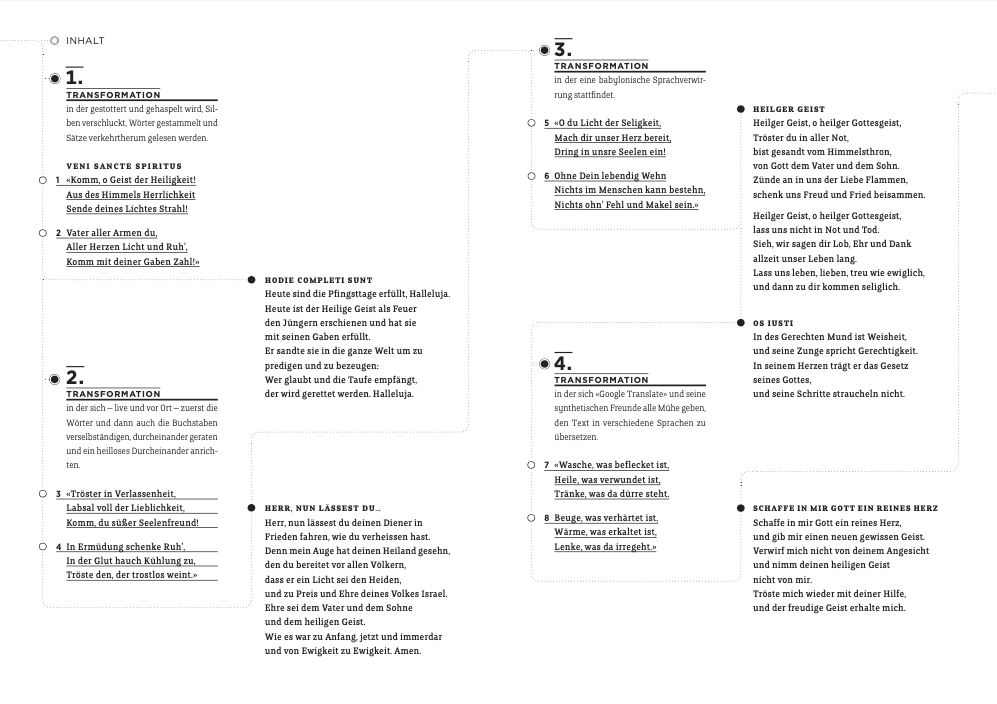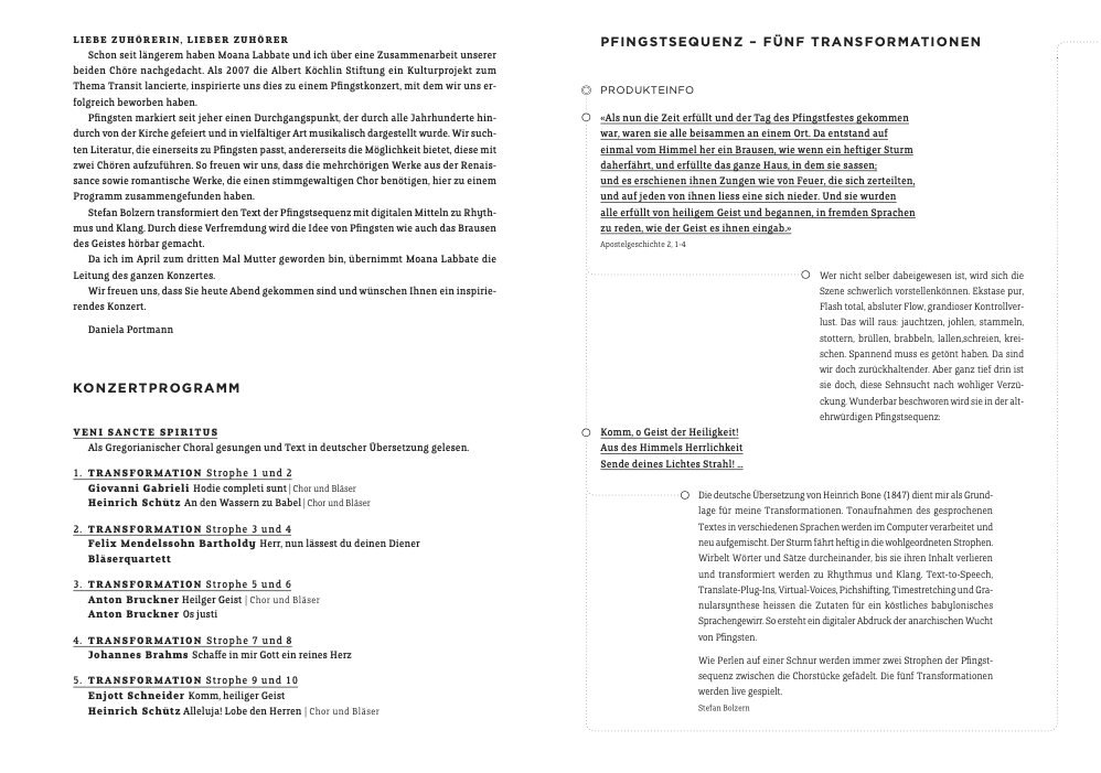 Wie Perlen auf einer Schnur werden immer zwei Strophen der Pfingstsequenz zwischen die Chorstücke gefädelt. Die fünf Transformationen werden live gespielt.“ – Aus dem Textheft